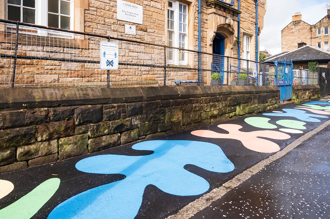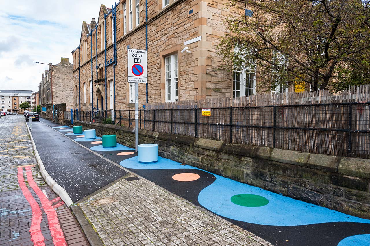 These improvements at Dalry Primary are also designed to benefit the whole community. We’ve worked with a fantastic artist to create colourful street art and a more relaxed environment for everyone to spend time along Cathcart Place, Springwell Place and Dalry Road, and we hope local residents and visitors enjoy the fun designs and opportunities to rest as much as pupils.